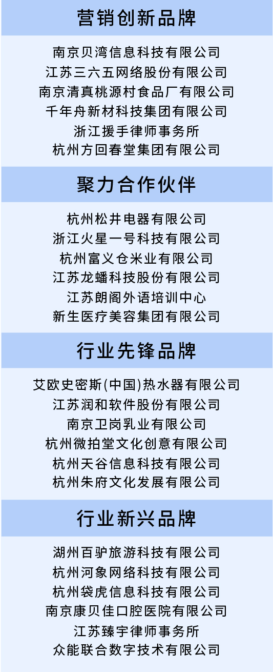 在百度品牌之夜活動上,根據(jù)數(shù)據(jù)趨勢、百度搜索熱度排名、行業(yè)影響,分別發(fā)布了營銷創(chuàng)新品牌、聚力合作伙伴、行業(yè)先鋒品牌、行業(yè)新興品牌等獎項(xiàng),24家江浙品牌企業(yè)榮獲獎項(xiàng),以鼓勵江浙品牌企業(yè)長遠(yuǎn)發(fā)展。