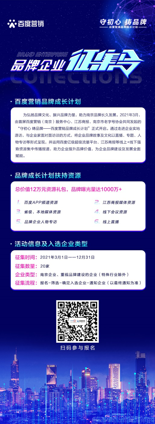 百度從傳統(tǒng)的網(wǎng)絡(luò)搜索引擎到移動互聯(lián)網(wǎng)時代的深度布局,正以技術(shù)推動創(chuàng)新,以AI人工智能深度賦能城市建設(shè)、產(chǎn)業(yè)升級以及品牌新競爭等價值升維。在智能經(jīng)濟發(fā)展的宏觀大環(huán)境下,百度將積極求新求變、加速升級迭代,用技術(shù)驅(qū)動商業(yè)增長,創(chuàng)新加速品牌成長,助力社會經(jīng)濟發(fā)展新勢頭。“百度營銷品牌計劃”第二期正面向廣大品牌企業(yè)進行征集,有興趣的品牌企業(yè)可掃描下方報名二維碼參與,期待有更多的品牌企業(yè)加入到活動中,展現(xiàn)品牌活力、書寫品牌榮耀。