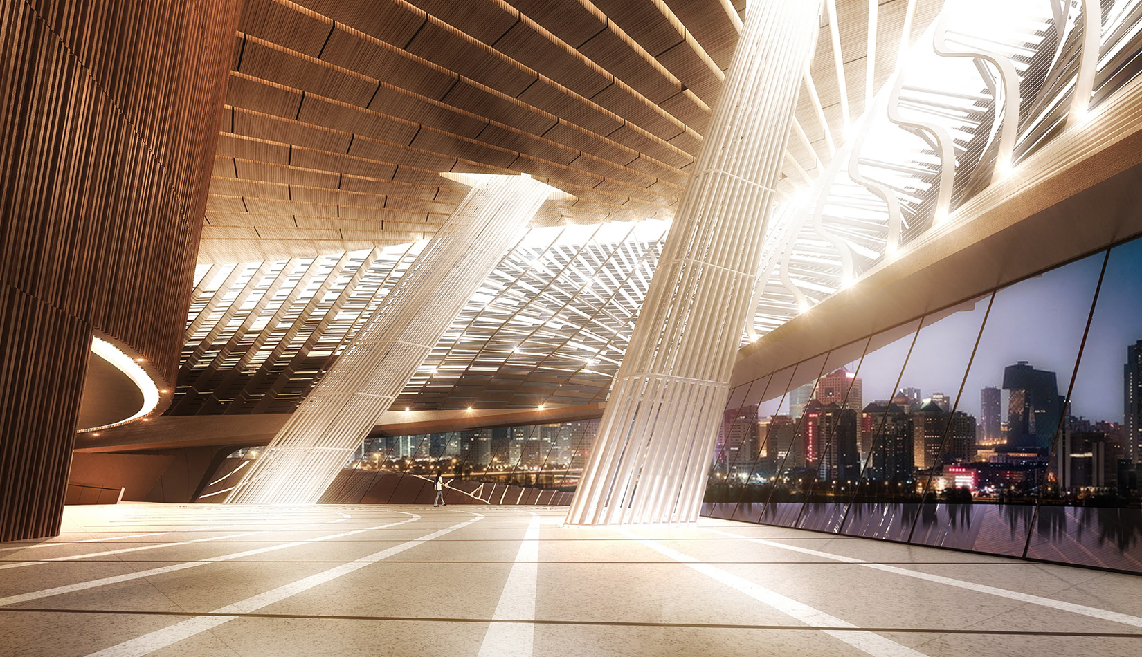 觀眾廳整體空間形態(tài)采用馬蹄形設計,觀眾廳建聲采用聲學墻與裝飾墻結(jié)合的方式。延建筑東南部呈“U”型環(huán)繞觀眾廳布置,觀眾二層、三層休息廳設置吹拔,結(jié)合兩側(cè)連續(xù)坡道,構(gòu)成游走空間,將各層休息廳在空間上相互連通,并結(jié)合建筑表皮,形成莊重、典雅又不失生動的空間體驗。
