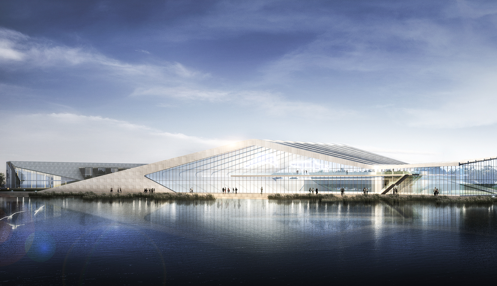 海洋科技館坐落在中科院青島科教園沿海區(qū)的中心地帶,沿海岸線呈一字型布局。方案設(shè)計以浪花和貝殼為意象,建筑像從場地中生長出來,擁有著與海浪一樣流暢的外形,在與基址和諧相融的同時,也呼應著青島的城市文化和人文關(guān)系。大跨度鋼結(jié)構(gòu)結(jié)構(gòu)排架為大空間的開放展示提供了可能,同時營造了無間斷的觀??臻g??萍拣^外墻以玻璃幕墻為主,保證了觀海景觀通透性。