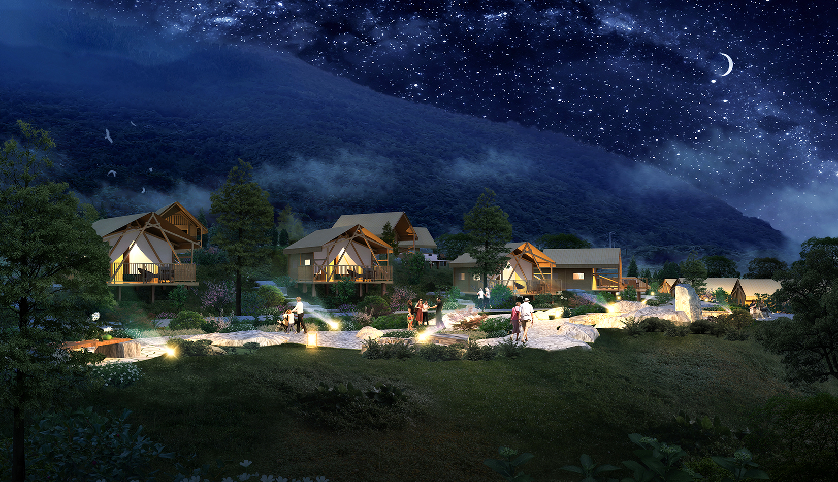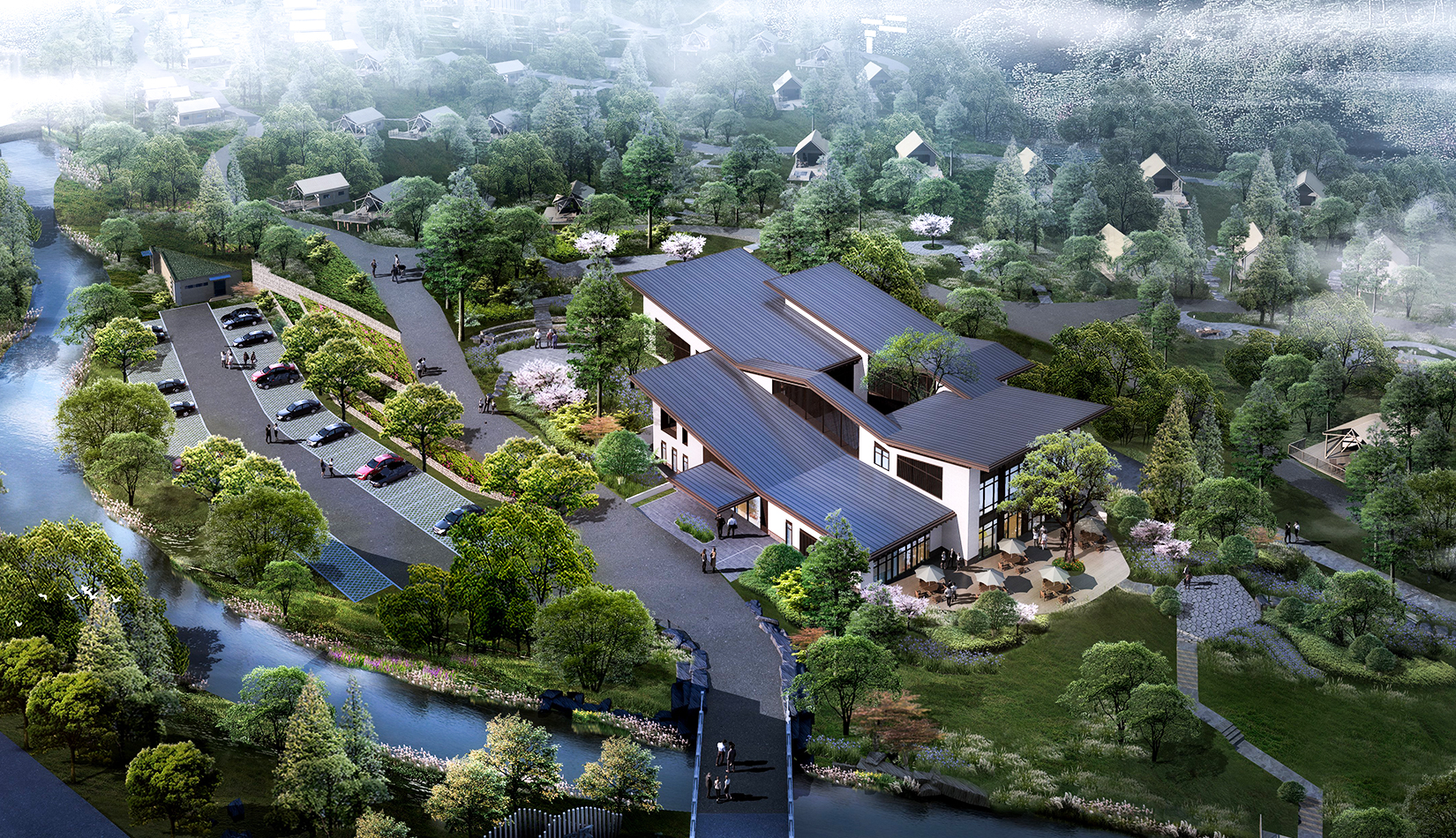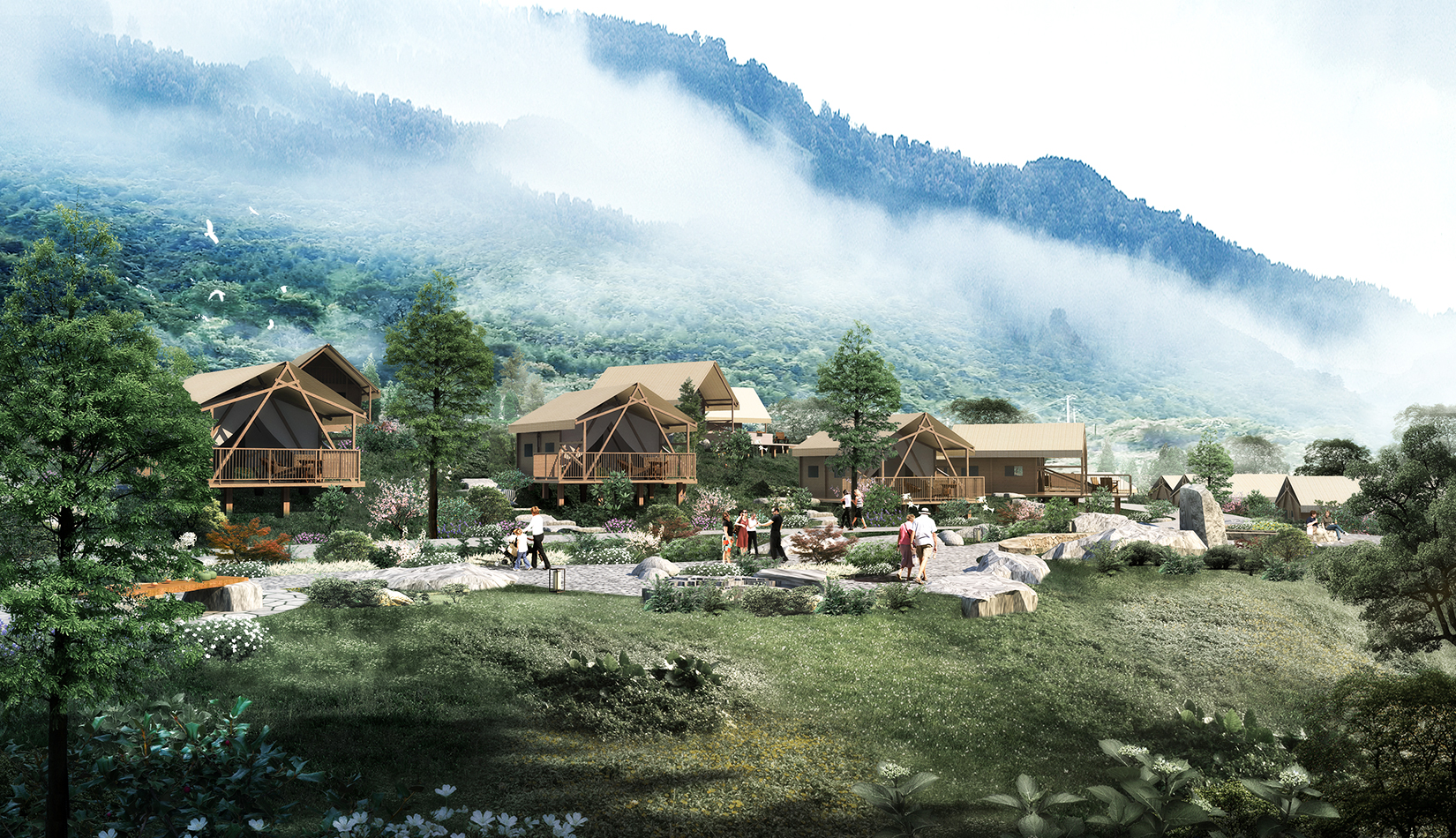 根據(jù)基地的地勢(shì)分布及功能需求,空間結(jié)構(gòu)上分為“一帶兩軸三核心五組團(tuán)”。建筑設(shè)計(jì)的五個(gè)組團(tuán),分別是濱水休閑組團(tuán)、水畔風(fēng)光帳篷組團(tuán)、高端養(yǎng)心帳篷組團(tuán)、中心服務(wù)組團(tuán)及山居野趣帳篷組團(tuán)。客房部分采用帳篷度假屋的方式,凸顯野奢度假的浪漫形式。