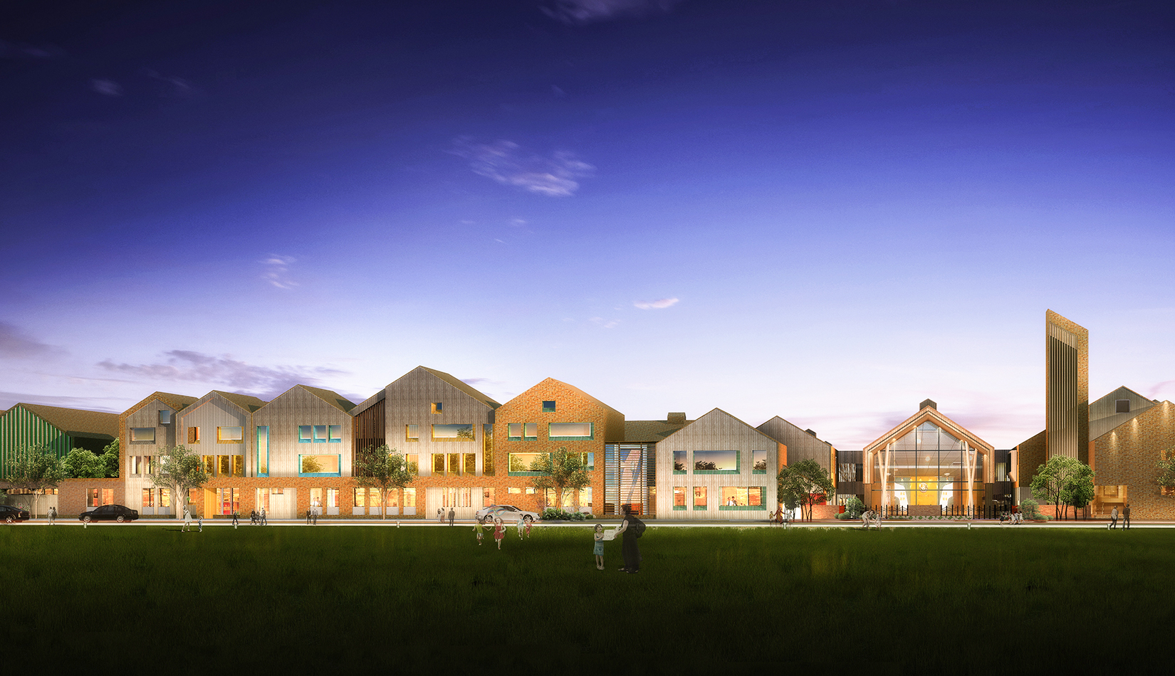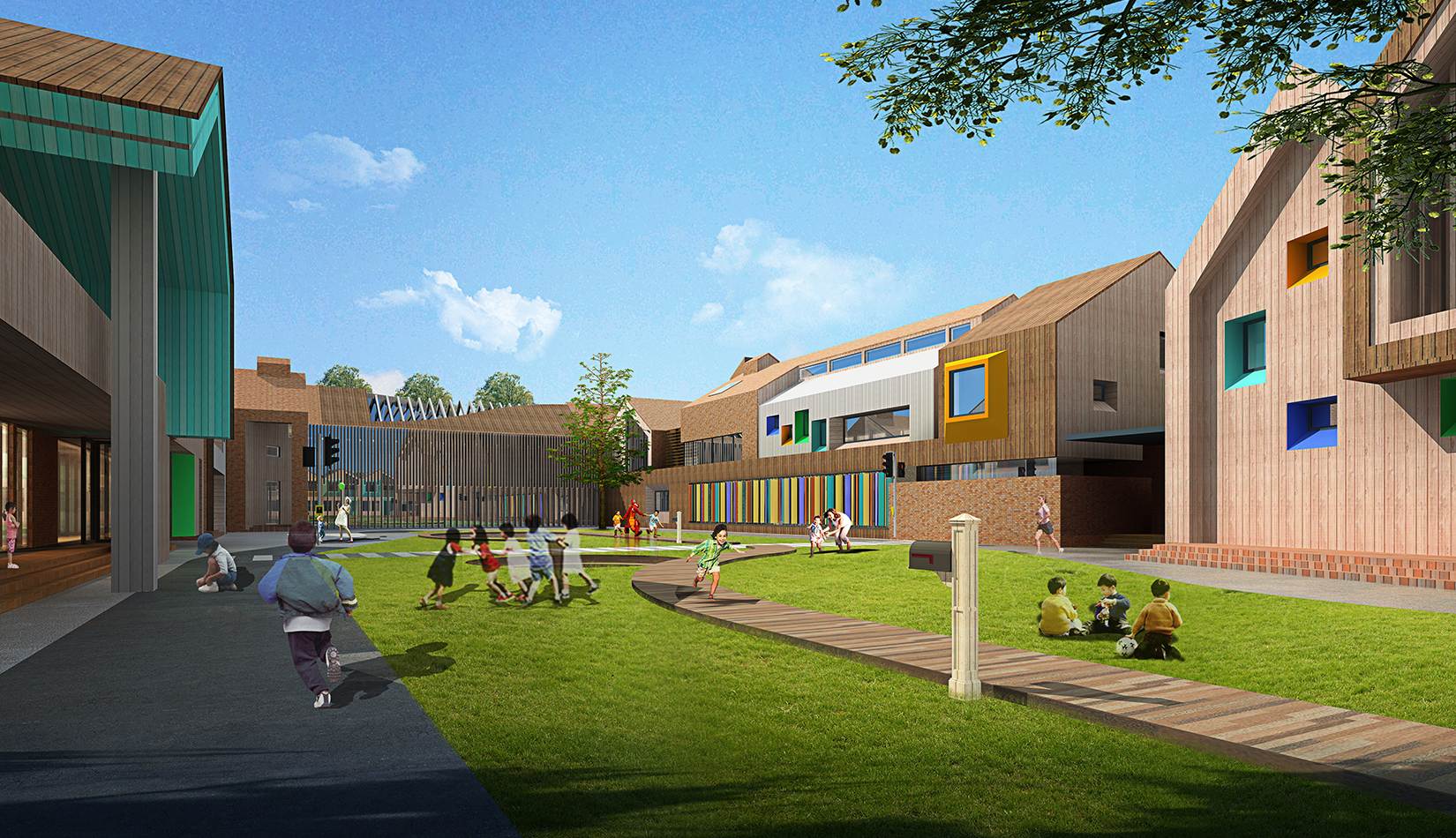該項目設(shè)計以“陽關(guān)小鎮(zhèn)”為設(shè)計概念,采用“城鎮(zhèn)”規(guī)劃布局,通過引入街道、廣場、庭院等元素,將校園空間打造為小鎮(zhèn)場景,讓學(xué)生感受城市氛圍及生活氣息。