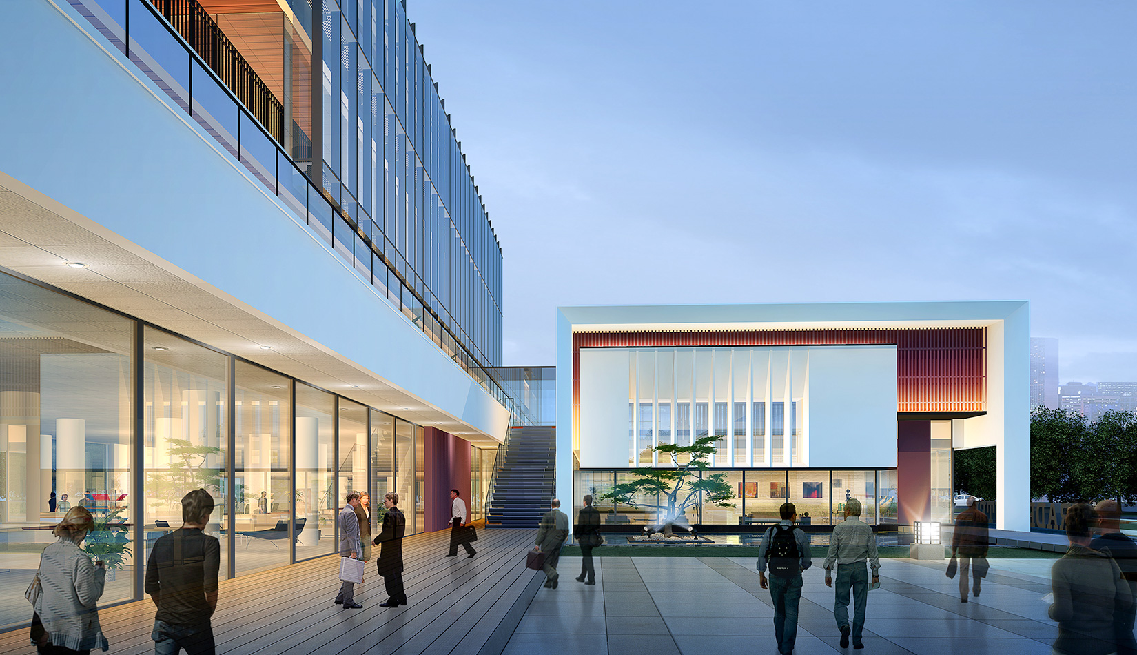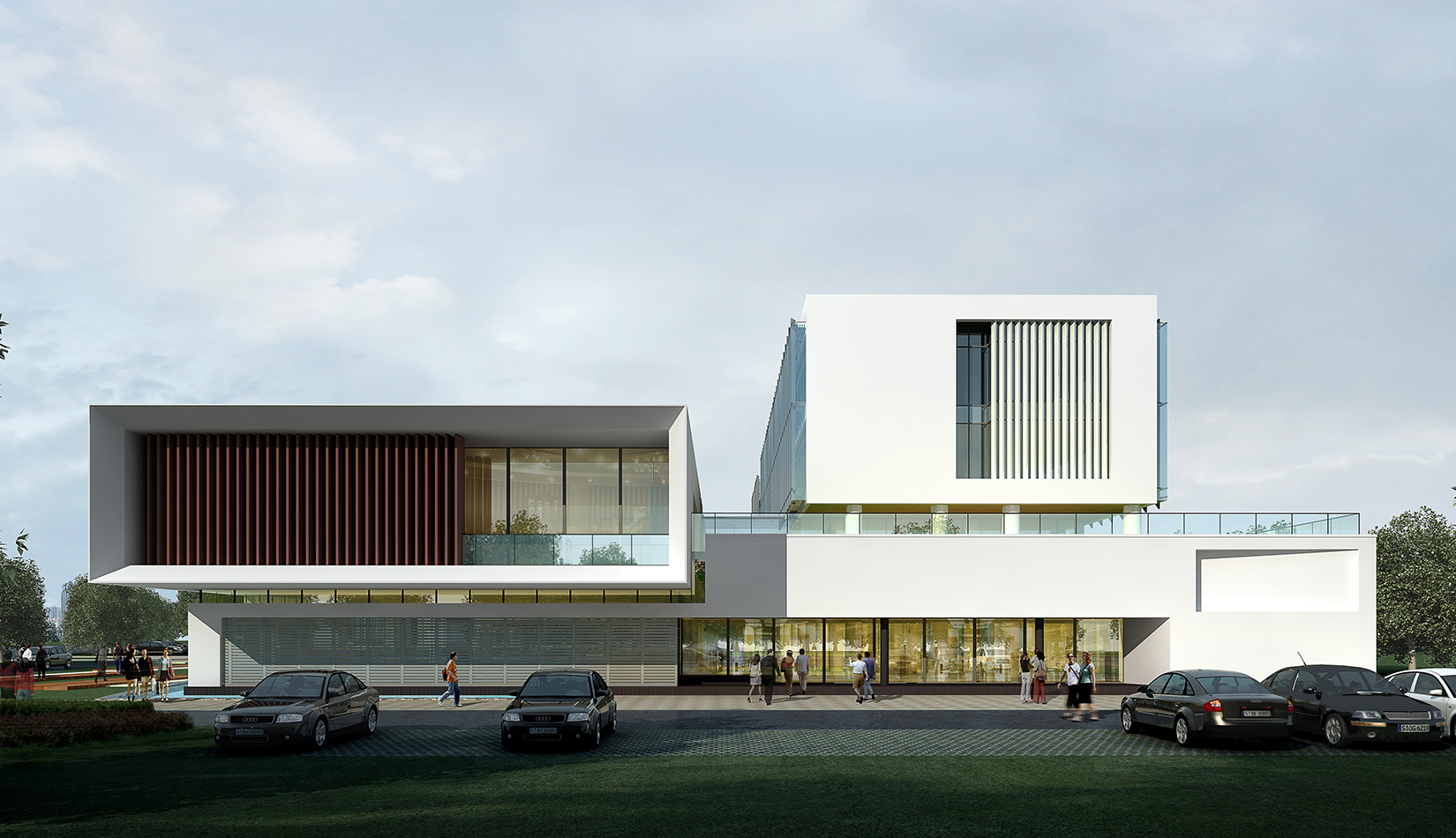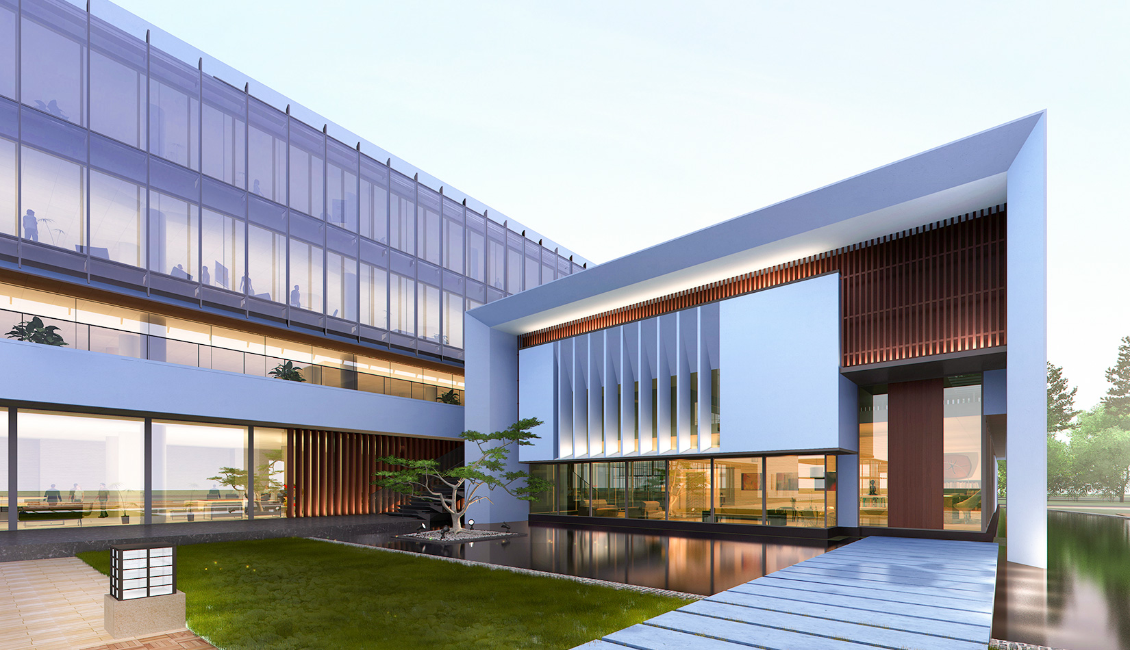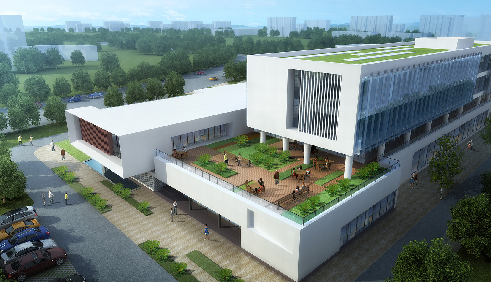作為中韓貿(mào)易合作區(qū)一期啟動區(qū)的重點(diǎn)項(xiàng)目,其承擔(dān)著對外展示以及為后續(xù)發(fā)展提供服務(wù)平臺的功能。因此設(shè)計(jì)力求穩(wěn)重大氣,以4 層的體量打造出地標(biāo)性的建筑。設(shè)計(jì)運(yùn)用簡潔的外形、寧靜的色彩,外立面以白色涂料和木格柵為主,尊重自然,打造一種平和寧靜的感覺。在空間設(shè)計(jì)上通過共享空間、上人露臺和一層大平臺,創(chuàng)造出舒適宜人的工作環(huán)境;在技術(shù)上通過地源熱泵、呼吸式幕墻、雨水收集等的應(yīng)用,實(shí)現(xiàn)建筑的綠色節(jié)能環(huán)保。
