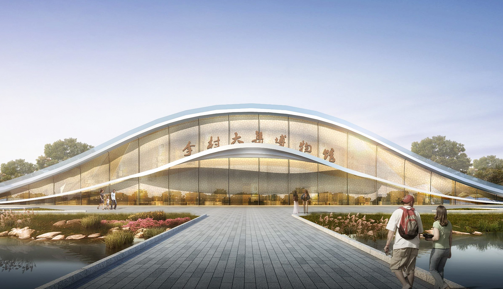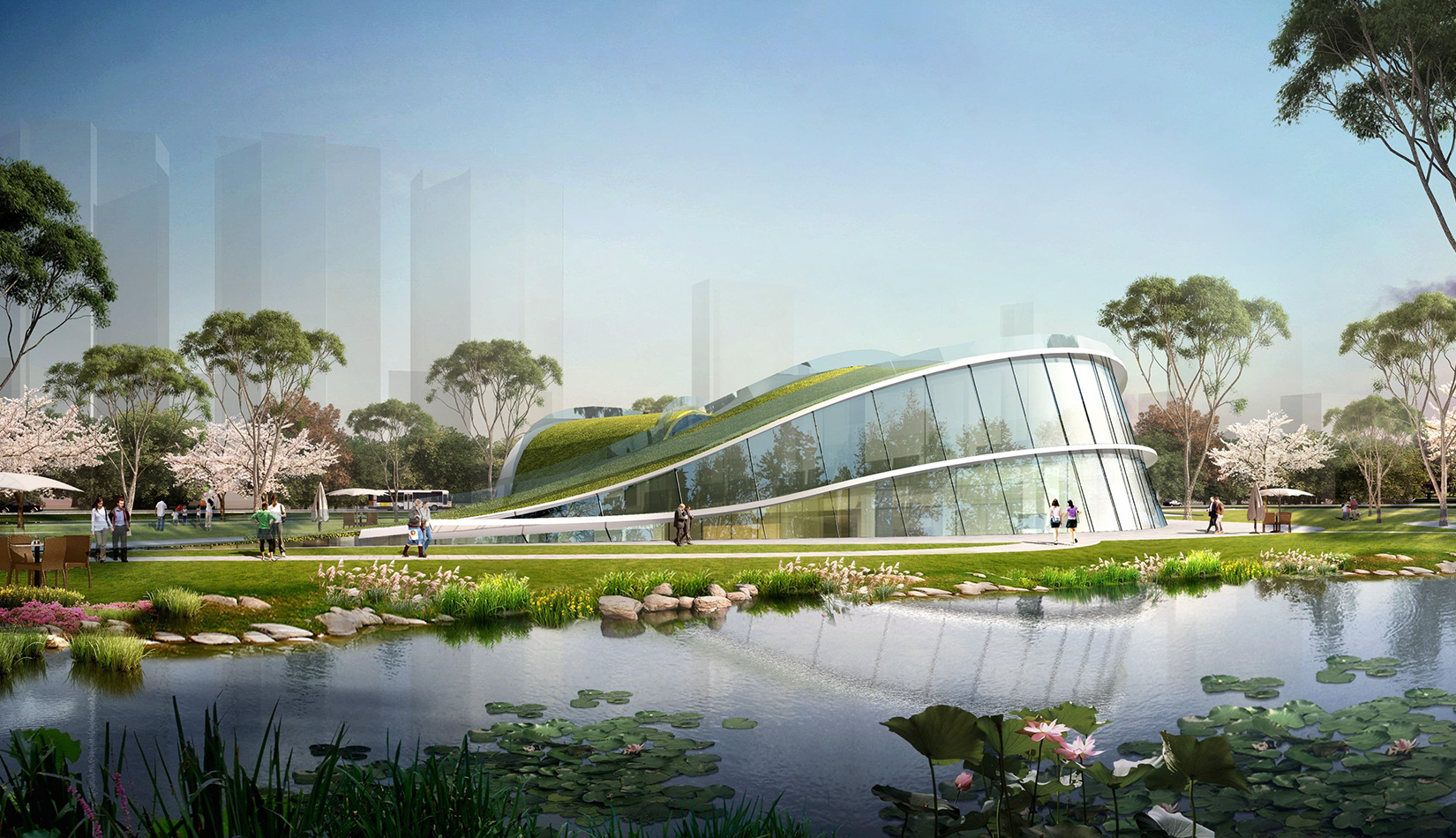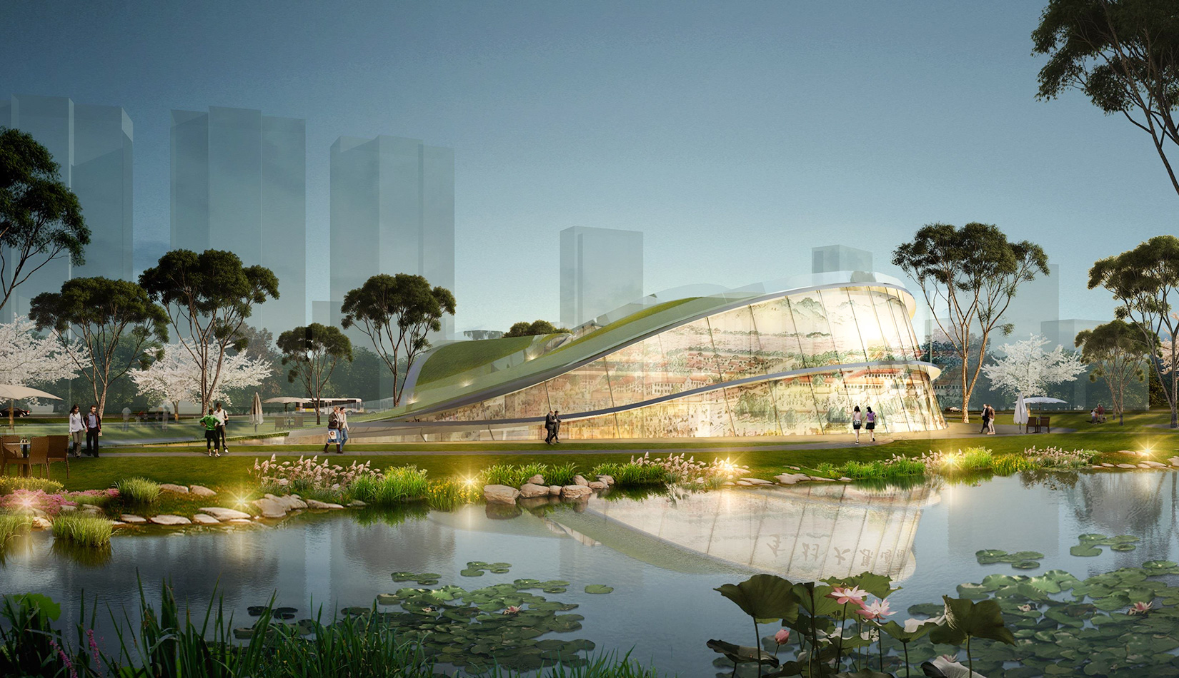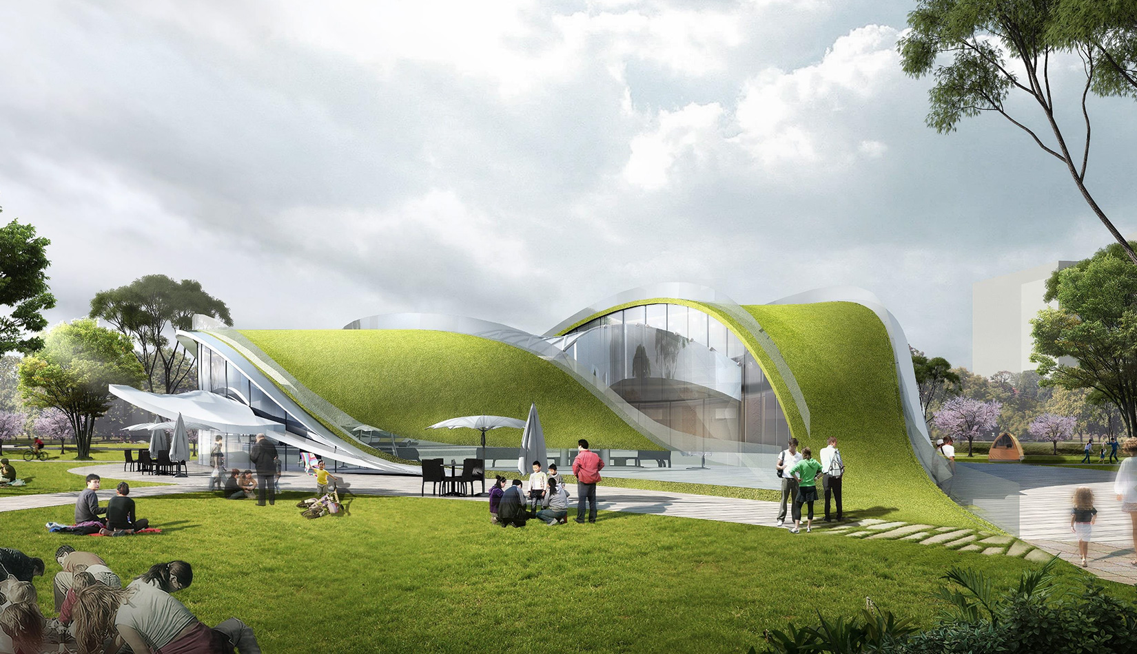 該項(xiàng)目基地位于濱河公園內(nèi),目標(biāo)要將博物館打造成一個生態(tài)建筑,建筑能與環(huán)境有機(jī)融合。在這一理念下,將博物館設(shè)計(jì)為樹葉形,建筑猶如一片樹葉飄落在公園內(nèi),以此體現(xiàn)建筑與環(huán)境的融合。將樹葉形建筑設(shè)計(jì)為覆土建筑,最大程度還原基地一片綠色,以此呼應(yīng)李村大集的“還原”內(nèi)涵。通過設(shè)計(jì)兩個曲線形體相互交融形成建筑的最終體量,以此體現(xiàn)相逢意蘊(yùn),呼應(yīng)李村大集的“相逢”內(nèi)涵。